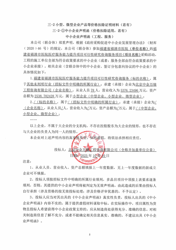 2、北京中金万瑞工程咨询有限公司按邀请招标文件要求提供小微企业扣除证明材料,投标报价给予15%价格扣除,用扣除后的价格参加评审。